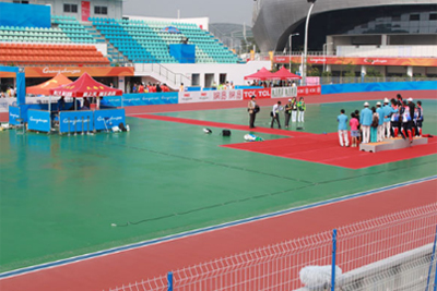 无锡丙烯酸球场的温度缝不仅是善后的修补工作,切割的时候更应该特别注意。新水泥基础浇铸后必须切割合理温度伸缩缝,原则以不大于6×10m为一方块切割,浇铸施工板块间必须切割温度缝,温度缝宽为5~8 mm,缝深不少于20 mm,(150 mm厚以上混凝土基础缝深不少于30 mm),以保证基础热胀冷缩能集中在温度缝中变化,不导致基础其它地方开裂。